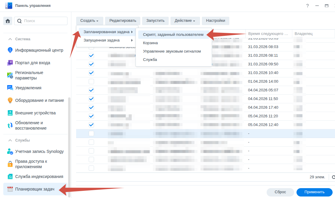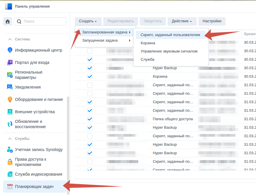 затем идём в «Панель управления» -> «Планировщик задач» -> «Создать» -> «Запланированная задача» -> «Скрипт, созданный пользователем»