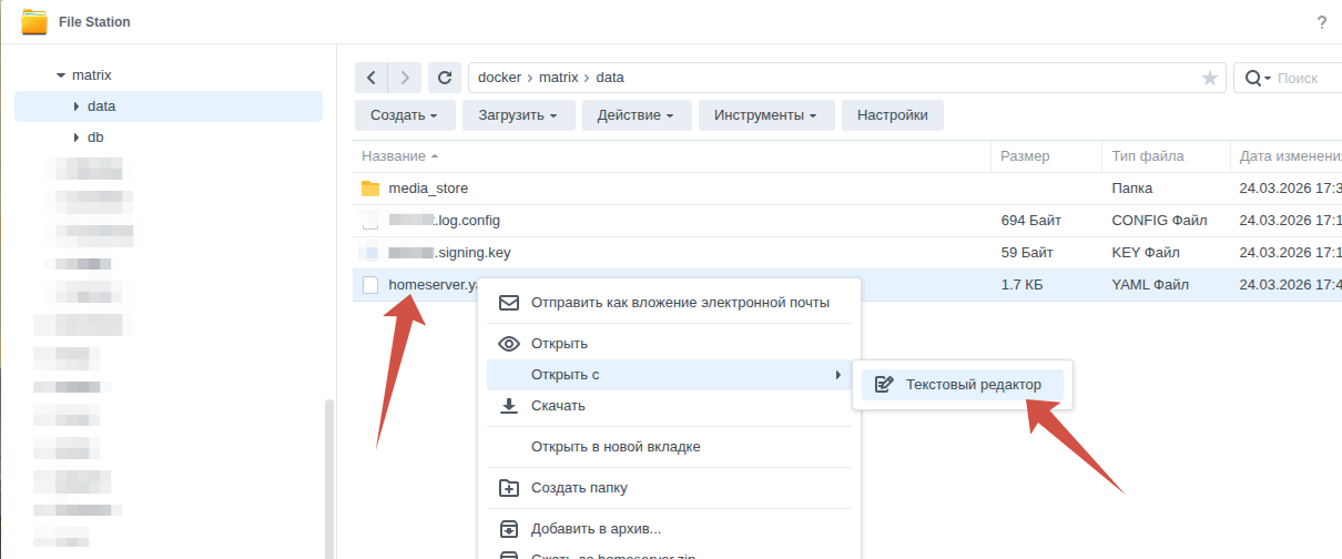 condition: service_startedобратите внимание, что пусти /volume1/docker/matrix/db и /volume1/docker/matrix/data должны вести на папки, созданные выше