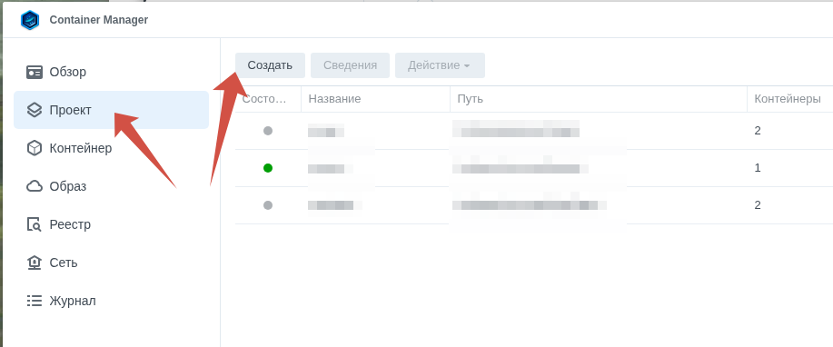 идём в Container manager, Проект и жмём «создать»
