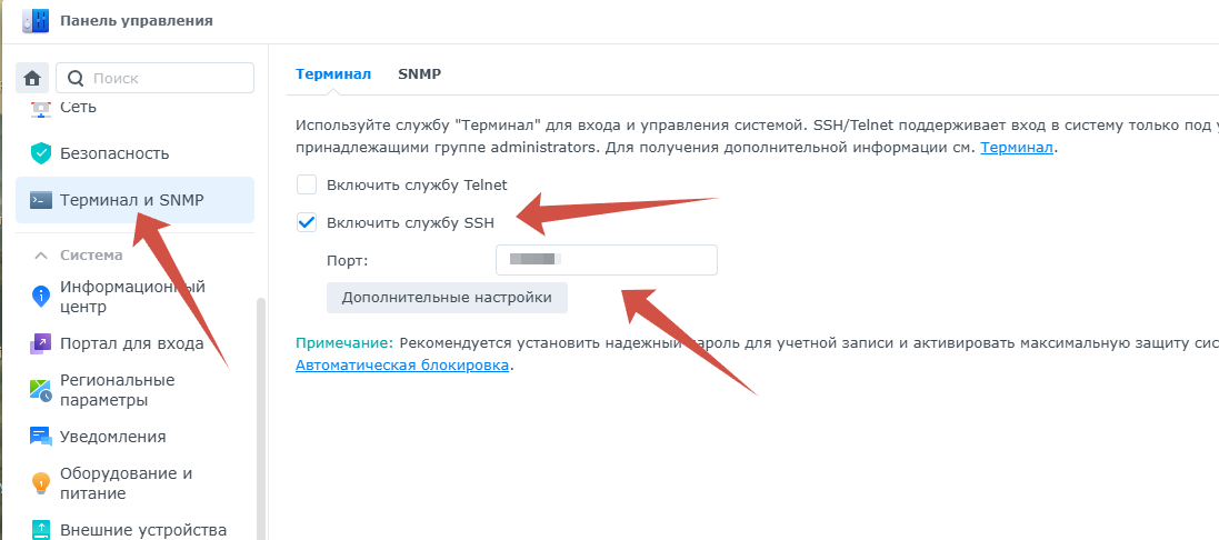 Для применения исправления, нужен доступ к серверу через SSH. Чтобы его включить перейдите в «Панель управления» -> «Терминал» и установите галочку напротив «Включить службу SSH», обязательно смените 22 порт на свой уникальный (49152-65535).